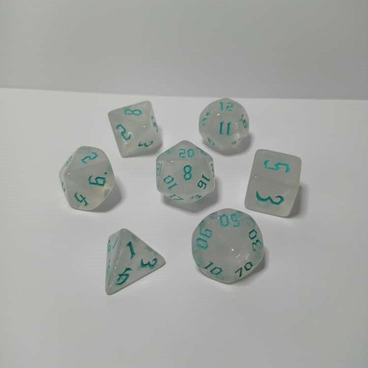 Okyanus dalgalarının ferahlığından ve kristal berraklığından ilham alan bu beyaz simli zar seti turkuaz rakamlarıyla masaüstü oyunlarınıza canlılık ve büyü katıyor