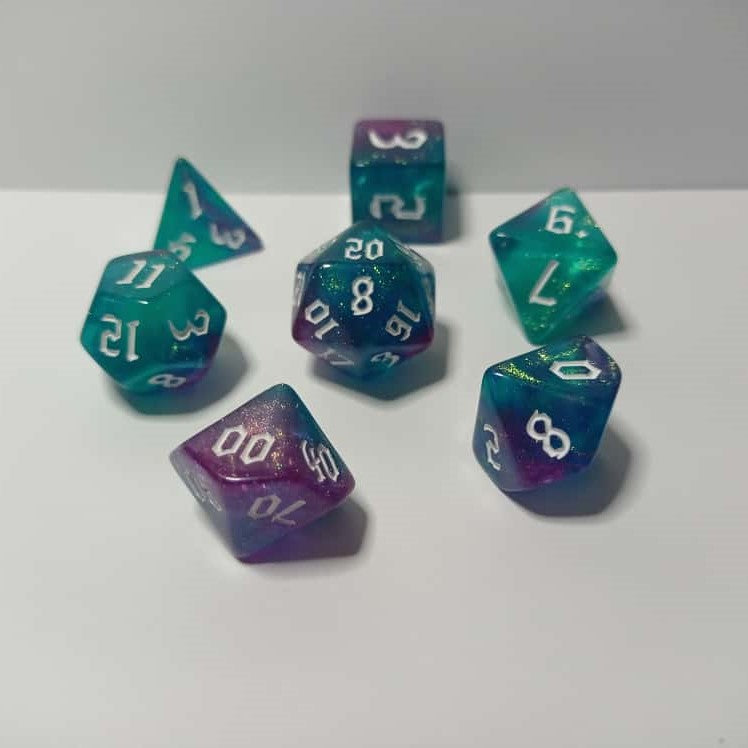 Gecenin büyüsünden ve yıldız tozlarının parıltısından ilham alan bu simli mavi-mor zar seti, masaüstü oyunlarınıza renk ve gizem katıyor. Her zar, büyüleyici renk geçişleri ve simli yüzeyiyle fantezi dünyalarına açılan bir pencere sunar. Hem oyuncular hem koleksiyoncular için eşsiz bir seçim!