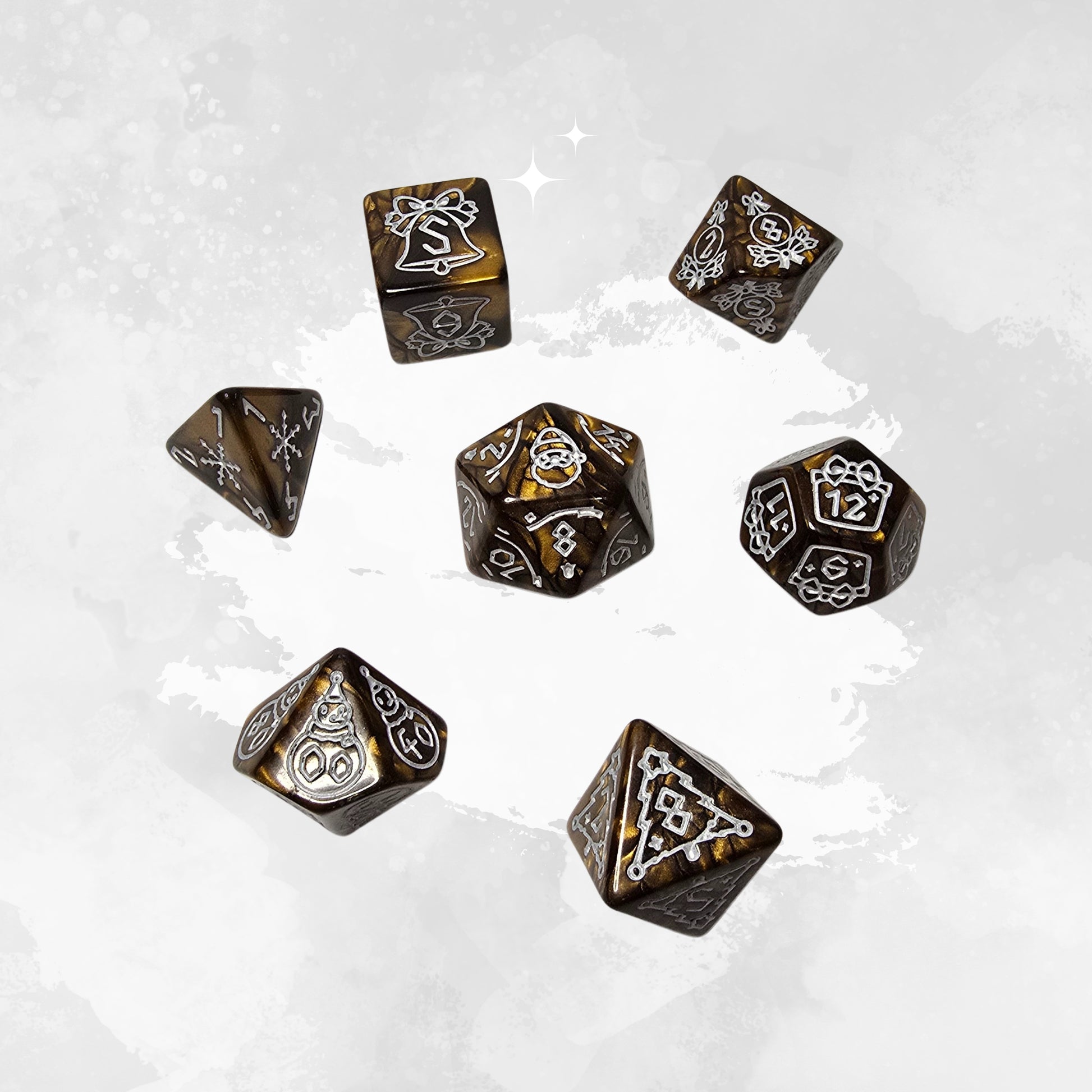 Kış mevsiminin altın ışıltısından ve yılbaşı ruhunun sıcak enerjisinden ilham alan bu kehribar renk Christmas temalı zar seti masaüstü oyunlarınıza zengin, büyülü ve festivale yakışır bir atmosfer katar