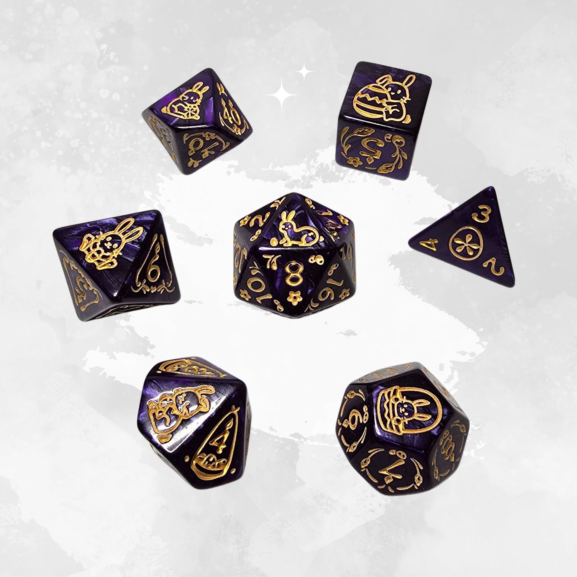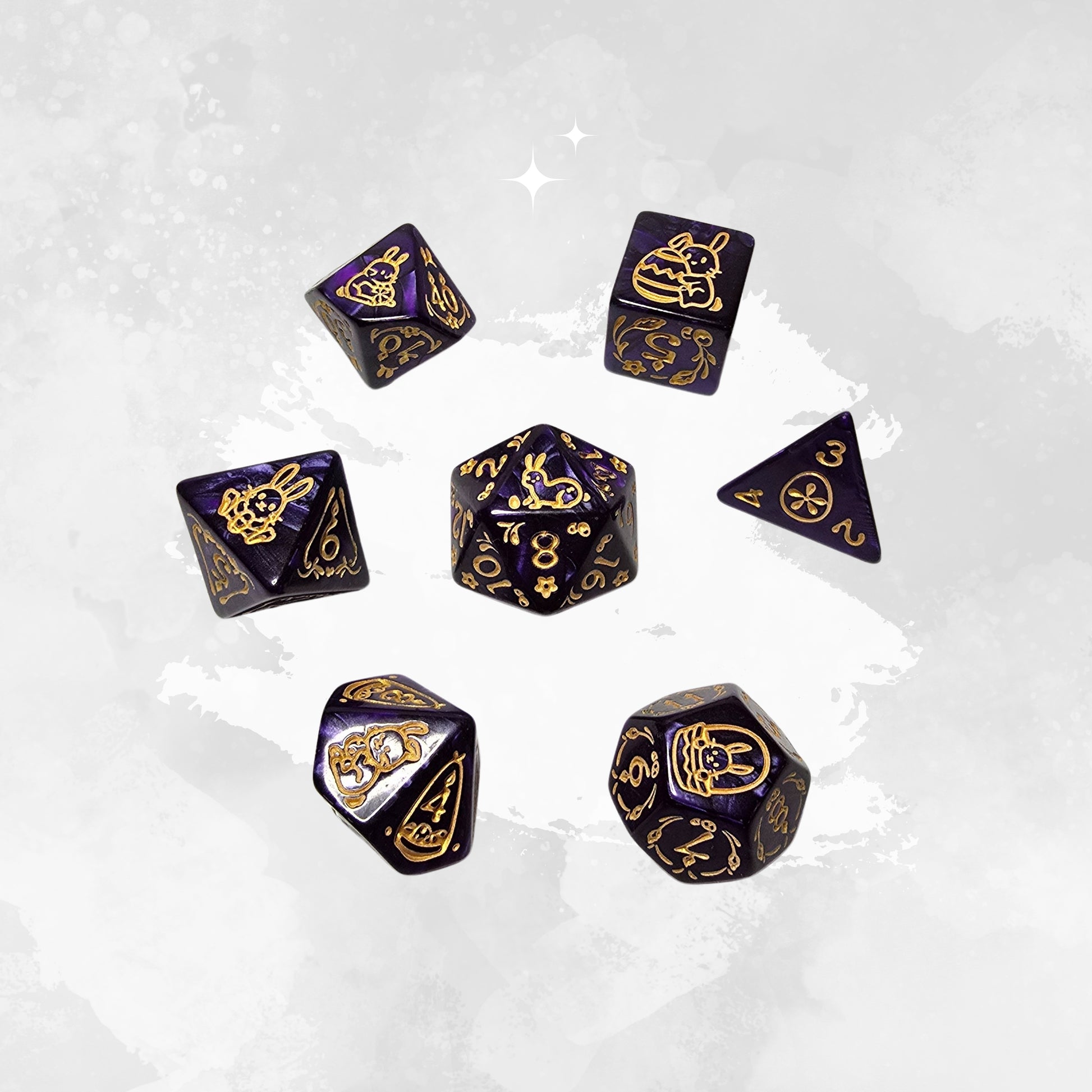 Alacakaranlığın gizemli mor tonlarından ve gecenin masalsı doğasından ilham alan bu mor tavşan temalı zar seti masaüstü oyunlarınıza büyülü ve mistik bir atmosfer katar